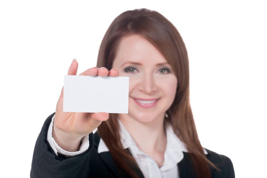 Close-up image of a smiling businesswoman holding empty white card