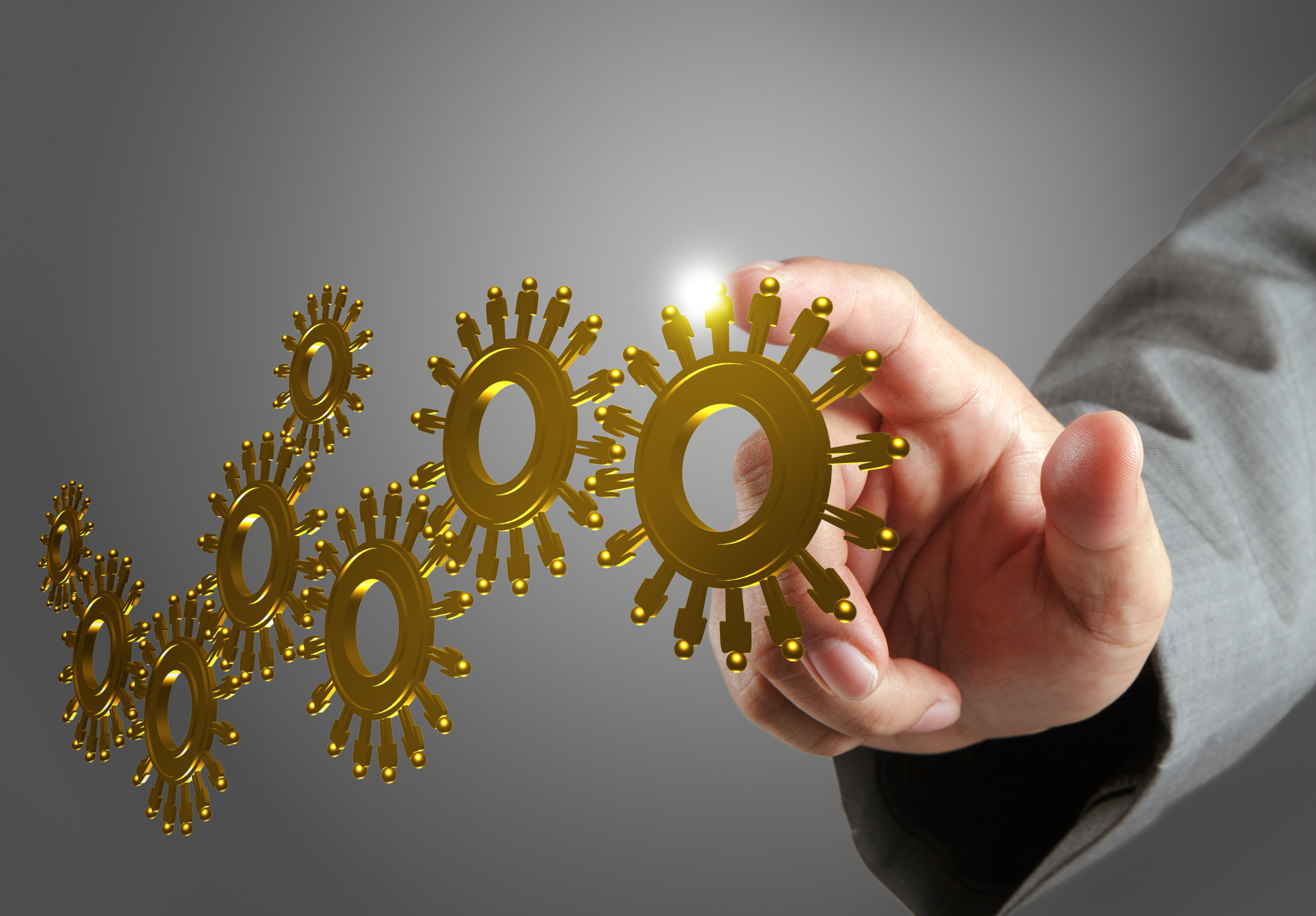 businessman hand and gold people cogs as concept