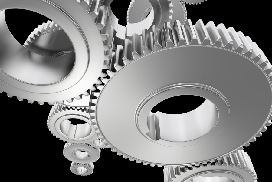 Steel Gears Background. Technology Background with Steel Cogwheels on Solid Black Background. 3D Rendered Illustration.